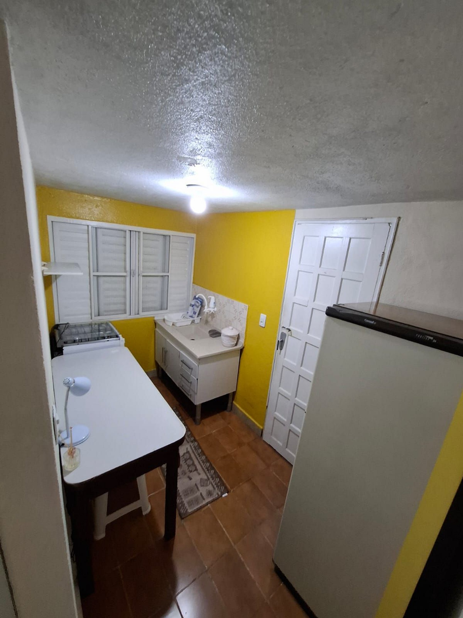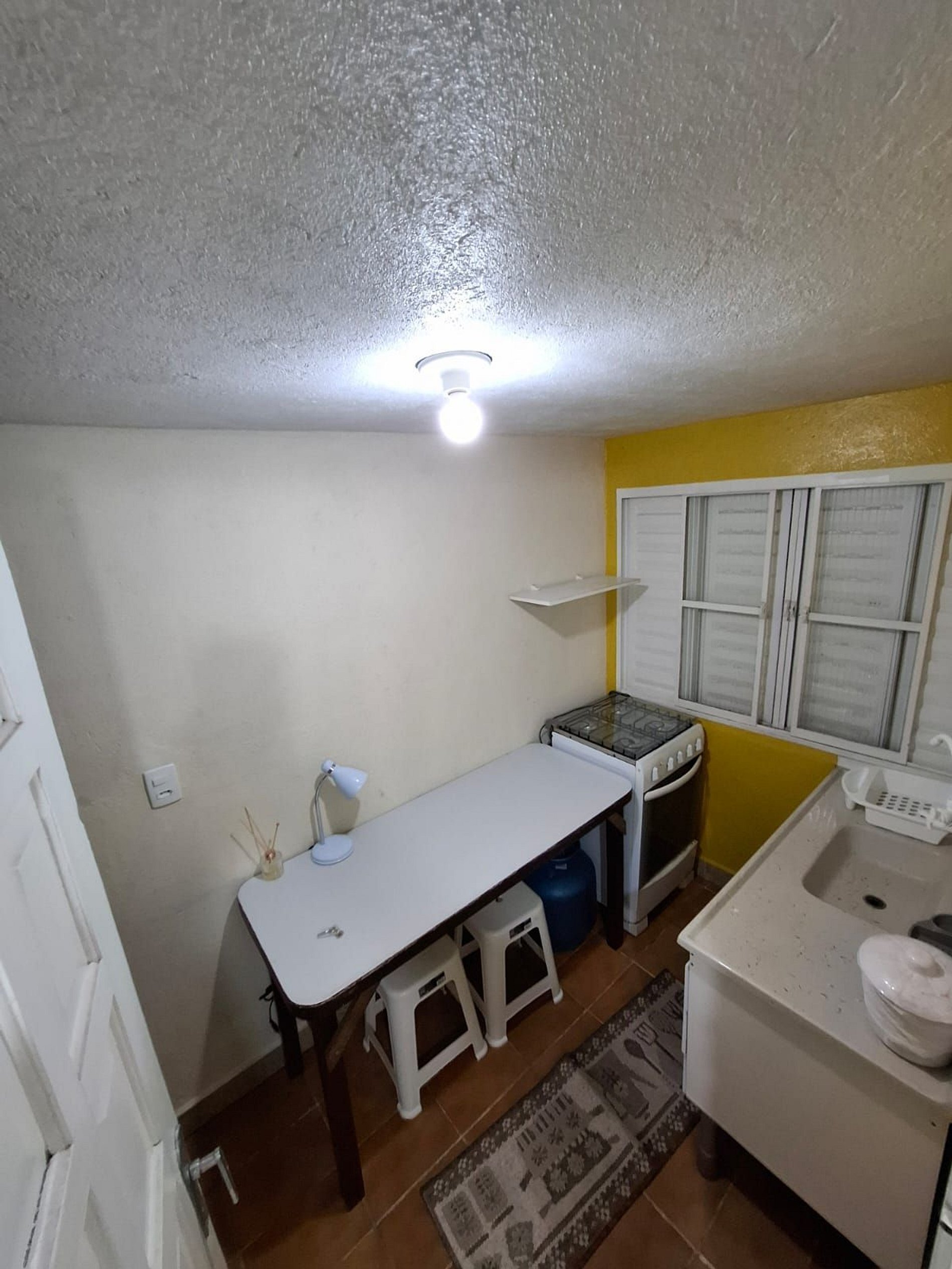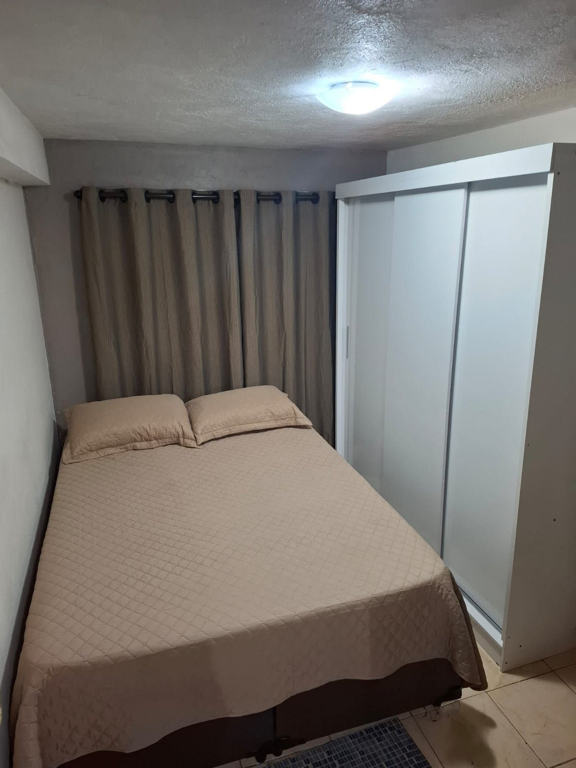 Mobiliado com cama box de casal, colchão de molas ensacadas, guarda roupas de 3 portas e cabideiro, cozinha compacta para seu dia dia de forma prática e única, dispõe de geladeira e fogão com forno a gás.